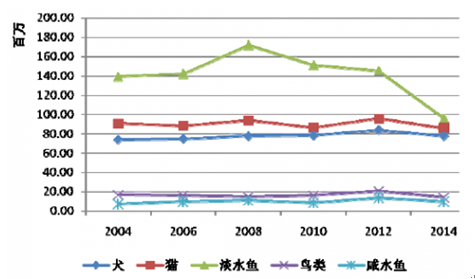 如上圖所示,除淡水魚呈下降趨勢外,其他各類別的寵物數量相對穩定,且保持在較大規模,至2014 年末,寵物犬的數量為7,780 萬只,寵物貓的數量為8,580 萬只。