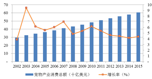 據數據顯示,美國約 65%的家庭至少擁有一只寵物。1994 年,美國寵物產業消費規模僅為170 億美元;2015年, 美國寵物產業消費規模達到 602.8 億美元, 預計 2016 年將達到 627.5 億美元。美國寵物經濟發展的爆發期從 21 世紀初期開始,到 2003-2005 年發展最快,年復合增長率達到 7.5%以上。隨后,美國的寵物產業進入平穩增長期,雖然經歷了 2008 年金融危機和經濟復蘇期,但寵物產業仍保持著超過 4%的增長速度。