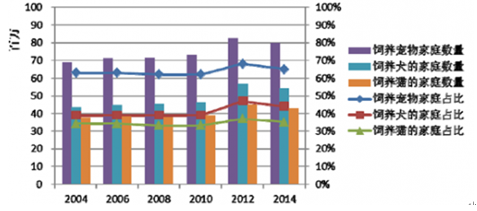 從上圖可以看出,在美國,飼養寵物有著廣泛的家庭基礎,自2004 年至2014年間,飼養寵物的家庭比例始終保持在 60%以上,且在最近幾年該比例略有提高,飼養寵物已成為穩定的社會需求。另外,從該圖中亦不難看出,在美國飼養犬類和貓類寵物的家庭數量和占比均較高。至2014 年末,飼養犬類寵物的家庭數量為5,440 萬戶,占美國全部家庭比例的44%;飼養貓類寵物的家庭數量為4,290 萬戶,占美國全部家庭比例的35%。同時,該兩項指標與美國飼養寵物的家庭比例變動趨勢一致,即在最近幾年略有提高、長期來看趨于穩定。