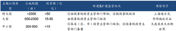 具體來說,規劃總占地面積為2000畝以上或總投資50億元以上的為特大型主題公園; 占地面積600畝至2000畝之間或投資額在15億至50億之間的為大型主題公園;占地 200畝至600畝之間或投資額2億至15億之間的為中小型主題公園。