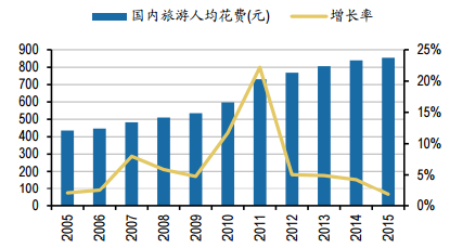 據世界旅游組織的預測,2020年中國將成為世界第一大旅游國家,每年將有1.4億的國際游客,占全球國際游客總量的8.6%。而隨著居民收入水平提高,旅游消費的能力越來越高,2015年國內旅游人數達到40.0億人次,人均花費854.9元,2008年以來復合增長率為14%和8%。