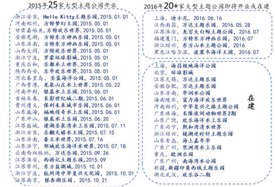 僅15-16年已開業及在建的主題公園就有約40家,其中15年開業的重大項目 包括浙江安吉的Hello Kitty主題樂園、安徽和山東的方特東方神畫樂園等,而16年上海迪士尼、各地的萬達主題樂園等也將陸續開園。