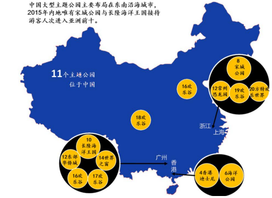 中國主要大型主題公園分布在東南沿海的發達地區(以2015年為例)