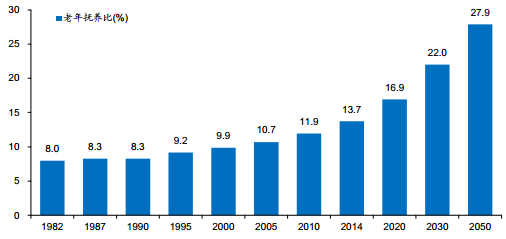 1979 年,《中共中央關(guān)于加快農(nóng)業(yè)發(fā)展若干問題的決定》指出“努力實行計劃生育”,獨生子女政策開始正式推行。隨著獨生子女政策的推出,從 80 年代初開始,我國老年人口占比持續(xù)增長。1982 年我國老年人口撫養(yǎng)比僅為 8%,到 2014 年該數(shù)據(jù)已經(jīng)增至 13.7%。根據(jù)全國老齡辦預(yù)測,我國老齡化進程將持續(xù)到 2050 年,屆時撫養(yǎng)比將達到 27.9%(注:老年撫養(yǎng)比=65 歲以上人口/ 15-64 歲人口*100%)。