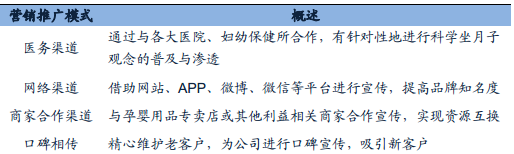 月子中心服務(wù)對(duì)象為產(chǎn)婦和新生兒這一特殊人群,服務(wù)時(shí)間一般為嬰兒出生后一個(gè)月內(nèi),針對(duì)某一單獨(dú)客戶的服務(wù)時(shí)間較短,不具有重復(fù)消費(fèi)的特點(diǎn),因而開發(fā)新客戶的頻率較高,導(dǎo)致該行業(yè)在營銷推廣方面的投入較大。目前月子中心的營銷推廣主要有醫(yī)務(wù)渠道、網(wǎng)絡(luò)渠道、商家合作渠道、口碑相傳這四種模式。
