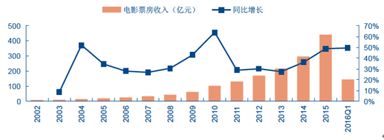 3、在消費新生代逐步崛起、文化產業蓬勃發展的背景下,我國影視消費市場持續保持旺盛成長態勢。據國家新聞出版廣電總局電影專資辦統計,2015年全年我國電影票房收入達440.69億元,同比增速逾48%。2016年一季度,全國票房收入達145億元,同比增長49.56%;今年全年全國總票房有望突破600億,增長速度超過35%。