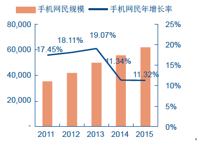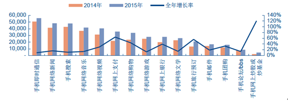 2014-2015年中國移動互聯網應用的用戶規模及其年增長率(單位:萬人)