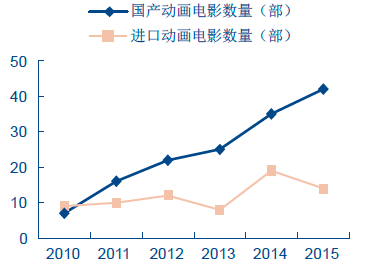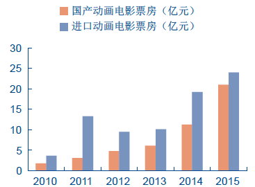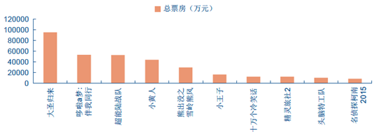 年度排名電影名稱總票房(億元)類型1美人魚33.9國產2瘋狂動物城15.3進口3西游記之三打12國產4澳門風云311.16國產5功夫熊貓39.98進口6奇幻森林9.04進口7星球大戰:原力覺醒8.25進口8蝙蝠俠大戰超人:正義黎明8.25進口9葉問37國產10北西26.19國產事實上,從全球電影市場來看,青少年/全年齡向動漫作品一直是一個非常重要的影視品類。頂級作品的全球票房容量達12億美元,表現出出色的全球性商業盈利和文化傳播實力。2016年第一季度全球上映的夢工廠動畫《功夫熊貓3》(10億)和迪斯尼動畫《瘋狂動物城》(15億)更是掀起觀影狂潮,接連打破國內動畫電影票房紀錄。