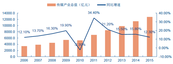 1、2015年以來,經濟增速的持續放緩使得產業轉型升級的需求不斷增強,新興產業被市場寄予了深切的期望。消費的擴容和技術的升級成為支撐文化傳媒產業持續健康發展的底層動力,傳媒行業持續進入中長期景氣階段。2015年傳媒行業的整體市場規模達到12754億元,同比增長12.3%,相對于GDP增速高出5.6個百分點。