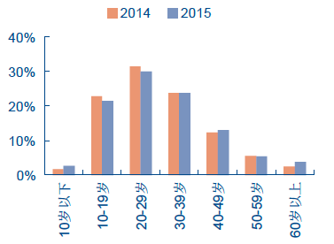 從網絡使用深度上看,2015年中國網民的人均周上網時長為26.2小時,較2014年底僅增長0.1小時,基本持平。從人群結構來看,網民中男女占比分別達到53.6%和46.4%,發展進一步均衡化。年齡結構方面,30歲以下的人群已經占到網民群體的54%。
