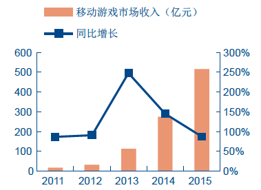 2015年,手游行業在經歷了以用戶數量增長帶來的銷售放量之后,正逐步進入用戶ARPU值驅動的發展新時期。截至年末,我國移動游戲用戶規模為3.96億人,同比僅增10.9%;實際銷售收入達514.6億元,同比增長87.2%,相較于2014年全年增速下滑57.4%。