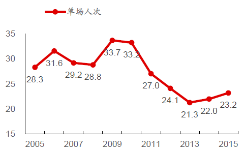 銀幕的利用效率從2005年開始翻了將近1倍,從2005年的單日單銀幕排片2.6場達到2015年每塊銀幕單日排片4.7場左右。而影院的工作時間一般是上午9:00至晚上23:00,單日屏幕的運轉時間極限值約為12-15個小時,以目前單片耗費2.5小時(計入檢票、清理等時間)左右來計算,單屏幕利用的極限值約在5-6場,未來增量空間有限。