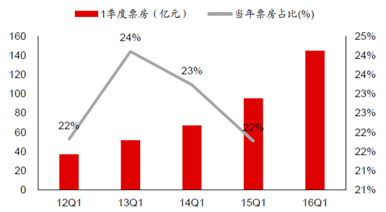 2016年1季度影市數據火爆,主要是受春節檔《美人魚》等優質影片供給拉動。今年1季度內地總票房同增50.9%至144.9億元,作為傳統旺季的2月,內地觀影人次增長超過77%,票房達到68.8億元,單月超過美國成為全球電影市場最大票倉。以每年1季度票房在全年票房的占比來測算,2016年第1季度全年票房占比若能保持過去4年的平均水平22%-24%,那么2016年全年票房將達到600 -630億元的區間。