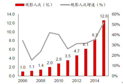 票房的高增長主要源自電影的觀眾基數迅速擴大。觀影人次從2006年的1億到2015年的12.6億翻了12多倍,9年中年均CAGR達到32.7%。以我國2015年的城鎮人口7.5億計算,我國城鎮人口人均觀影次數已經達到1.68次,超過了人均觀影人次較低的日本。