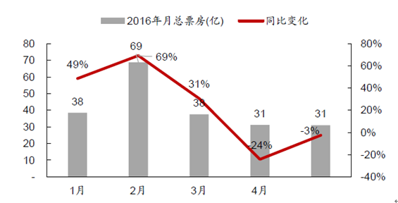 票房排名影片名稱15年4月票房/萬影片名稱16年4月票房/萬1速度與激情7212336奇幻森林785222戰狼52620火鍋英雄369493左耳30203倫敦陷落337694咱們結婚吧28338我的特工爺爺323195王牌特工:特工學院27637北京遇上西雅圖之不二情書230856萬物生長14488瘋狂動物城193097瘋狂外星人6505誰的青春不迷茫157508何以笙簫默6269蝙蝠俠大戰超人,正義黎明147349魔法總動員4547睡在我上鋪的兄弟1271310暴瘋語4472獵神:冬日之戰10032截至5月21日,內地票房達到200億元,達到200億元的速度領先去年37天。全年票房600億的目標將主要取決于暑期檔票房情況,2015年暑期檔票房同增37%達到124.31億元,期間《捉妖記》、《大圣歸來》、《煎餅俠》等影片直接點燃了資本市場對行業的投資熱情。