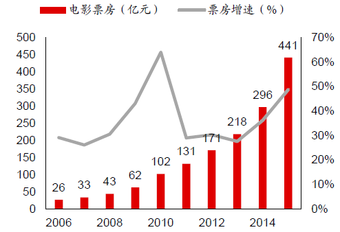 票房從進入新千禧年以來一直在迅速增長,過去13年CAGR達到34.6%。整體大盤票房從2002年的9.2億增長到2015年的440.7億,年均CARG達到34.6%。2012年我國超越日本成為世界上第二大電影票倉,2014年全球票房占比達到13%。而近三年我國票房的增長率還在逐步走高,2015年大盤增長近50%,據預測,這樣的高增長態勢短期還將持續,2016年票房同增40%以上突破600億元。