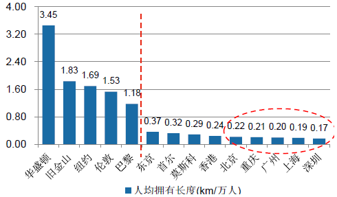 全球主要城市城軌人均擁有長度比較