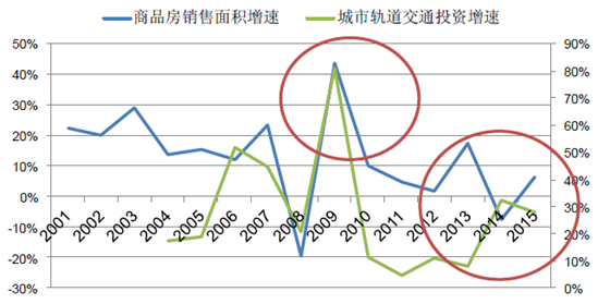 2008年,為了給被全球金融海嘯拖累的中國經濟打“強心針”,11月,國務院推出一項龐大的財政刺激計劃,宣布兩年內(到2010年末)投資4萬億元。為了配合“4萬億計劃”,2009年4月底,國務院推出新政,降低城軌、鐵路、商品住房等項目的資本金比例,極大地促進了城市軌道交通和房地產的快速發展,城市軌道交通投資增速和商品房銷售面積均在2009年創出歷史新高,緊接著房地產投資也在2010年創出新高(財政刺激計劃率先反應在了公共基礎設施建設上,同時房地產銷售走旺房價上升,房地產投資在后不斷走高。)