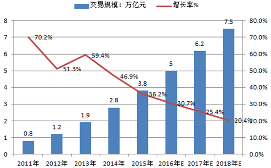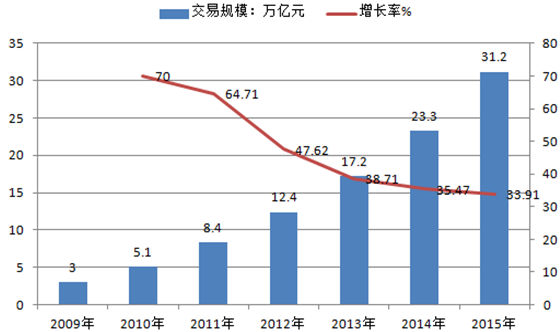 2009-2015年中國第三方支付市場交易規模(單位:萬億元、%)