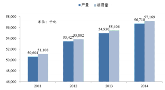 2011-2014年中國豬肉產(chǎn)量與消費量