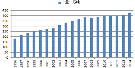 1996-2014年中國羊肉產(chǎn)量統(tǒng)計表(萬噸)