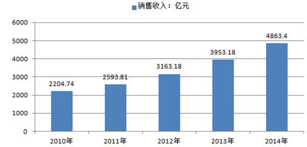 2010-2014年中國肉制品加工行業(yè)規(guī)模以上企業(yè)銷售收入(億元)