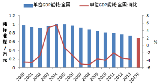 相比于世界水平,由于經濟結構和生產效率的原因,我國能耗水平較高。Wind資訊數據顯示,我國GDP單位耗能較高,2012年我國一次能源消耗占全球約21%,但GDP僅占全球的10%左右,單位GDP耗能超過世界平均水平的2倍,2013年度我國單位GDP能耗為0.74噸標準煤/萬元,單位耗能仍舊超過世界平均水平的2倍。近些年我國出臺了多部政策要求調整產業結構,淘汰落后產能,提高能效水平,并加強工業、建筑、交運、農業等行業的節能管理工作,逐漸建立并完善了節能行業產業鏈,包括節能相關材料(上游)、節能設備制造(中游)、節能應用和服務(下游)。