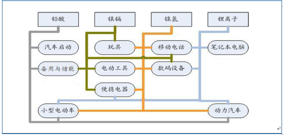 各種主要類型蓄電池在性能、技術(shù)特點和成本價格方面的不同優(yōu)勢和劣勢,決定了它們的不同應(yīng)用領(lǐng)域,各類蓄電池在一定范圍內(nèi)也存在相互替代性。下圖是各主要類型蓄電池的應(yīng)用領(lǐng)域:
