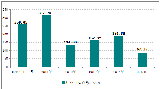 2010-2015年上半年我國電池制造行業(yè)利潤走勢圖