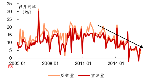 此前我國經濟高速發展時期,工業品運輸需求遠大于供給,企業利潤主要來源于市場份額的擴大以及營業收入的增加,所以為了迅速擴大生產規模,增加庫存量,企業對物流需求求量輕質,甚少考慮效率和成本。但隨著我國經濟中工業增速明顯放緩,GDP貢獻率已經開始低于幾乎不需要運輸的金融、住宿餐飲和其他服務業,工業品需求拉動的運力供給增長模式勢必面臨困境。自2011年后,公路運輸周轉量和貨運量增速下降趨勢非常明顯,近一年,公路貨運價格指數也長期位于榮枯線之下。原有服務工業企業的運力出現過剩,而快遞、冷鏈運輸等服務消費需求的運力出現結構性不足。
