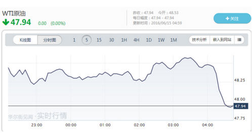 API最新數據公布后,美國基準原油WTI 7月期貨合約價下跌每桶0.93美元,跌幅超過1.9%,刷新日低至每桶47.94美元。國際基準原油布倫特原油價格同樣下挫,跌落每桶50美元關口。