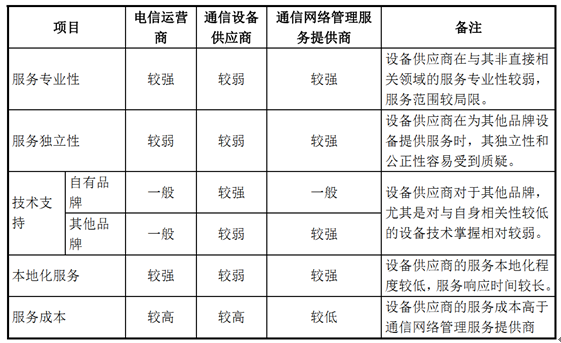 電信運營商、 第三方通信網絡管理服務提供商和通信設備供應商的比較如下表所示: