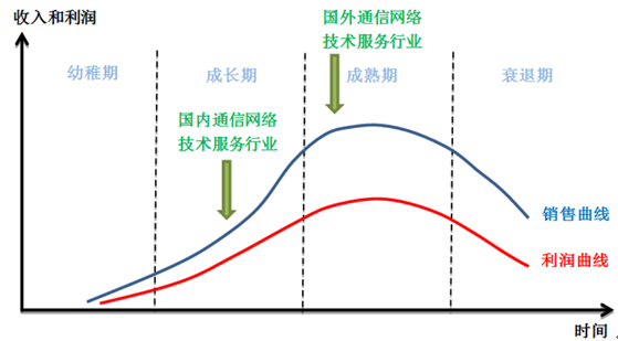 通信網絡管理服務是通信網絡技術服務的一部分。從全世界來看,通信網絡技術服務市場正處于逐步成熟的階段,特別是歐美等發達國家,通信網絡技術服務行業市場化程度較高,專業的通信網絡技術服務提供商技術水平也較高。由于我國通信網絡技術服務起步較晚,行業還處于成長期,如下圖所示: