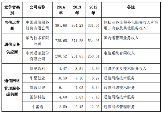 鑒于行業內通信網絡管理服務市場的主要競爭者包括電信運營商、 通信設備供應商以及第三方通信網絡管理服務提供商市場份額尚無權威統計, 根據主要公司公開披露的年度報告數據對其市場地位進行評判,具體如下: (單位:億元)