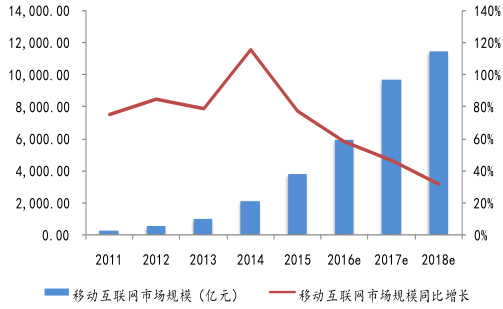 2011-2018 年中國移動(dòng)互聯(lián)網(wǎng)市場規(guī)模