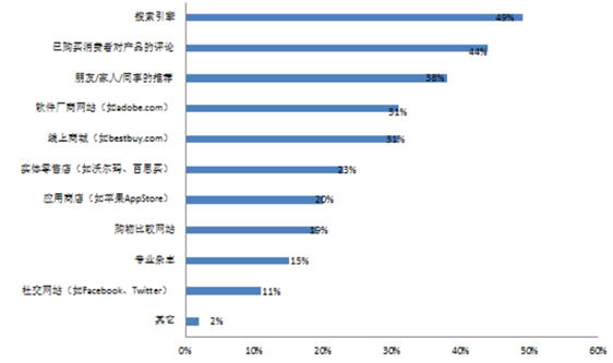 消費者獲取軟件產品信息的渠道主要包括搜索引擎、 其他軟件消費者在網上的評價、朋友/家人/同事推薦、軟件發行商網站、線上商城、實體零售店、線上應用商店(App Store) 、軟件對比和測評網站、技術雜志、社交媒體等。其中近一半的被調查者通過搜索引擎獲取產品信息,居各渠道之首;其次,44%的被調查者曾獲取其他消費者在網上的評價,38%的被調查者曾來源于朋友/家人/同事推薦。具體情況如下: