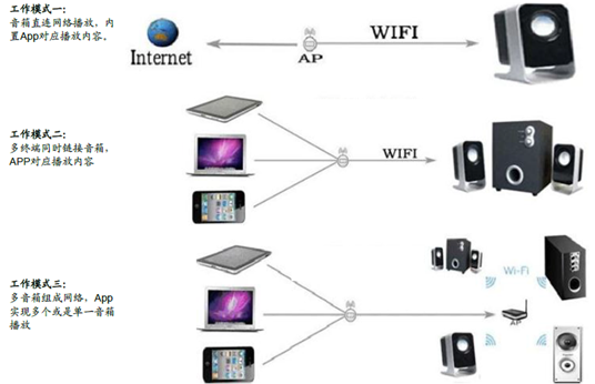 與常見的通過藍牙(BT)進行連接的無線音箱相比,WiFi 音箱有許多特有的優勢。首先WiFi 高帶寬,可以實現無損音樂的播放,便于網絡音樂應用為會員提供更好的體驗; 具備獨立上網功能,內置App 可以實現獨立播放,而不需要另外設置播放源;具備無線AP 作用,可以作為WiFi 中繼,強化網絡覆蓋范圍;可以組網,形成音樂播放系統;