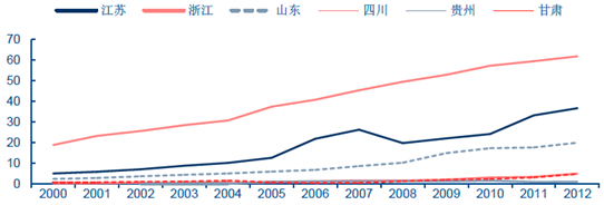 2014年每百戶城鎮家庭與農村家庭油煙機保有量相差54.3臺,城鄉比值為4.9,差異巨大,而冰箱、洗衣機的城鄉保有量差距分別為14.1臺、15.9臺,比值僅為1.2。橫向對比不同省市保有量,同樣發現存在巨大差異,根據2012年的統計,浙江等整體生活水平較高的東部省份,每百戶油煙機保有量超過60臺,而貴州、甘肅、四川等省份不超過5臺。在國內顯著的城鄉二元結構下,農村油煙機市場遠未打開,未來隨著城鎮化的不斷提升,以及整體居住水平的提升,油煙機需求有望實現加速釋放。