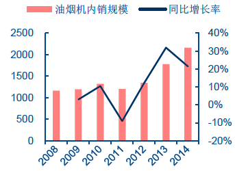 從內銷規模看,根據國家統計局數據,2014年油煙機內銷規模2158.5萬臺,僅相當于冰洗產品2008年的內銷規模水平,而2014年冰箱、洗衣機內銷規模分別為5339.4萬臺、4763.7萬臺,相差超過一倍,內銷規模成長空間無憂。2012-14年油煙機內銷規模同比增長率分別為12.1%、32.0%、21.5%,仍處于快速發展階段。預計未來5年CAGR仍將保持在10%左右。