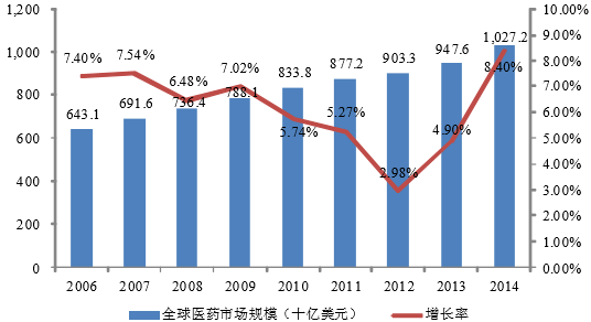 隨著經濟的發展、世界人口總量的增長和社會老齡化程度的提高,全球醫藥市場持續快速增長。盡管由于大量專利到期導致行業增速在2012年有所放緩,從2014年開始,全球藥品市場需求整體依然強勁,特別是新興市場的快速增長將繼續推動全球醫藥行業的發展。2006-2014年,全球醫藥市場規模及增長率如下