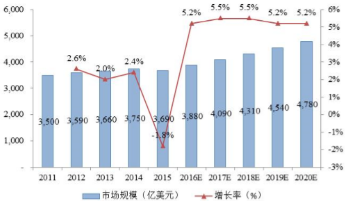 近年來,全球醫療器械產業穩步增長,市場規模從由 2011 年約 3,500 億美元增長為 2020 年預計約 4,780 億美元,2014-2020 年復合增長率約 4.1%。