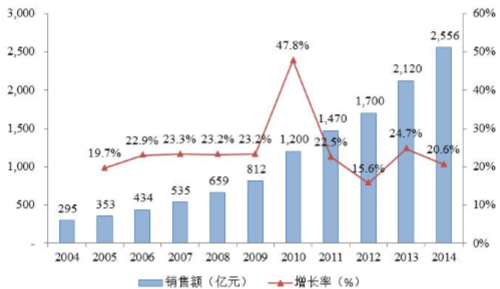近年來,我國醫療器械產業整體步入高速增長階段,取得了令世界矚目的發 展。醫療器械市場銷售總規模從2004年的295億元增長為2014年的2,556億元, 年復合增長率超過 20%。經過多年的持續高速發展,中國醫療器械產業已初步建成了專業門類齊全、產業鏈條完善、產業基礎雄厚的產業體系,成為我國國民經 濟的基礎產業、先導產業和支柱產業,到 2017 年我國醫療器械市場總規模預期 將超過 4,400 億元。