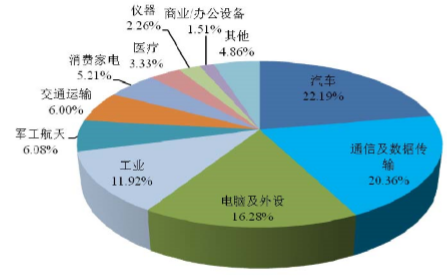 連接器的具體應用領域可劃分為汽車、通信及數據傳輸、電腦及外設、工 業、軍工航天、交通運輸等幾大類。2014 年,全球連接器主要 5 大應用領域是 汽車、通訊、電腦及外設、工業、軍工航天,合計占比達到 76.88%。