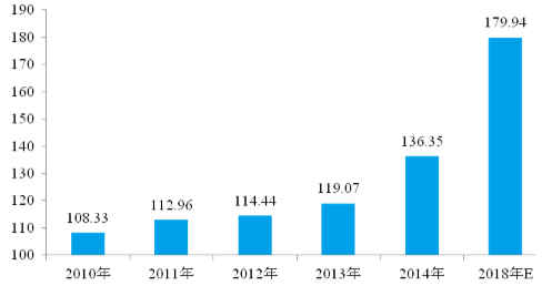 近年來,隨著國內工業化、信息化、城鎮化同步推進和內需潛力不斷釋放,國內制造業獲得了廣闊的發展空間,實現了量與質的雙重發展。中國在制造業規模已躍居世界第一位的同時,通過持續的技術創新大大提高了制造業的綜合競爭力,不但在一批大技術裝備取得了突破,更在一些新興產業中獲得 了較大的影響力,其中具代表性之一的智能手機產業。據 TrendForce 數 據,全球智能手機出貨量排名的前十位中,2014 年有 6 是中國品牌。國內制造業向著更廣、更深發展,擴大了廣泛應用在各種產品和設備中的連接器的國 內市場規模。2010-2014 年,中國連接器市場規模由 108.33 億美元增長至 136.35億美元,年均復合增長率為 5.92%,顯著高于全球同期 3.67%的增速。預 計 2018年,中國連接器市場規模將增長到 179.94億美元。