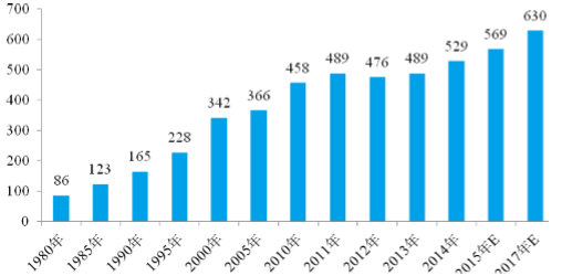 (1)連接器應用廣泛,通信及數據傳輸應用領域發展較快 經過多年發展,連接器應用范圍越來越廣泛,在各類設備中成為能量、信息穩定流通的橋梁,總體市場規模基本保持了持續增長的態勢。連接器的全球 市場規模已由 1980年的 86億美元增長至 2014年的 529億美元,年均復合增長 率為 5.49%。據 Bishop & Associates預測,2015年全球連接器增速為 7.5%,市 場規模將達到 569億美元。至 2017年全球連接器市場將達 630億美元。