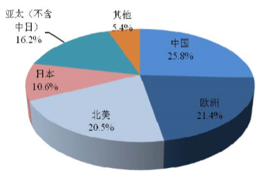 中國的連接器市場規模在 2014 年已達到全球 25.8%,成為全球大的連接 器市場,在全球是唯一占比超過 1/4的區域。