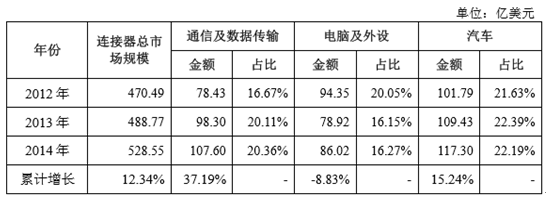 未來幾年,全球移動互聯網將在移動醫療、新能源汽車等新興產業的推動下保持快速發展勢頭,智能手機等智能移動終端產品的市場在更新換代中仍將保持繁榮狀態,可穿戴設備等新興產品滲透率將快速提高,因此通信及數據傳 輸市場仍能夠保持較快的增長速度。 電腦及外設應用波動較大,新技術成為增長點。電腦及外設用連接器的市 場規模在 2012年為 94.35億美元,在 2013年大幅下降到 78.92億美元,2014年 有所恢復,但距離 2012 年的水平仍有一定差距。近年來,全球臺式機、筆記本電腦銷量增長不穩定,同時新產品的單機使用接口數量隨著筆記本電腦的超薄化、無線化趨勢有所減少,造成了電腦及外設用連接器總體市場規模的較大波 動。未來隨著 Type-C 高速連接器的逐步推廣,相關新產品將擁有較大的增長空 間。 汽車是連接器第一大應用領域,新能源化和智能化助力增長。2012-2014 年,汽車用連接器的市場規模從 101.79 億美元增長到 117.30 億美元,略高于連接器總市場規模的增速,是連接器的第一大應用領域。連接器在汽車上的應用體現在汽車控制系統、安全系統、傳感器、底盤系統、指示面板,車載電子和娛樂設施等方面。全球汽車工業正處在新能源化和智能化的浪潮當中,以智能電動汽車為代表的新一代汽車產品在動力、控制、傳感、安全等系統中使用了更多的電子零部件,對連接器的數量需求和質量需求顯著增長,這將推動汽車用連接器市場在高基數水平上持續發展。