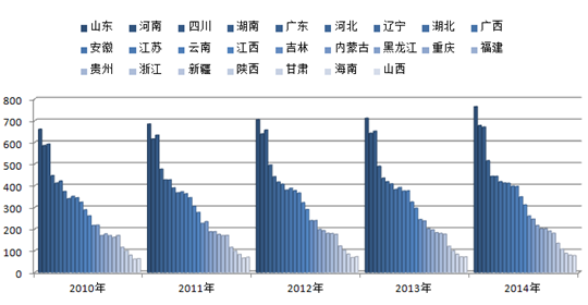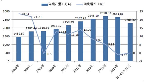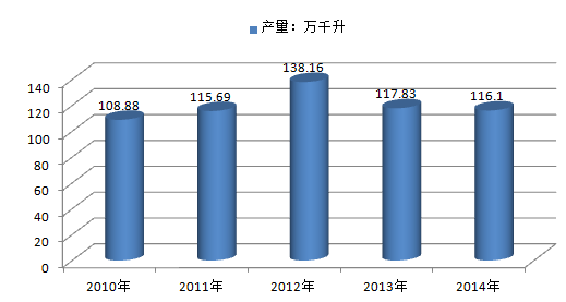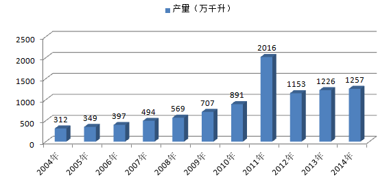 酒精類飲料如白酒、啤酒進入了個位數成長,未來在產品結構和渠道方面仍將面臨一定挑戰。葡萄酒受益于較低的基數、生活水平的提高,仍有廣闊的成長空間。2004 年-2014 年中國白酒行業歷史產量