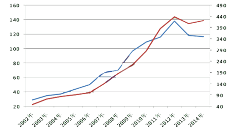 2002-2014年中國規模以上葡萄酒生產企業葡萄酒產量及主營業務收入增長趨勢圖