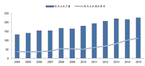 2004-2015年中國玉米產量及期末庫存(百萬噸)